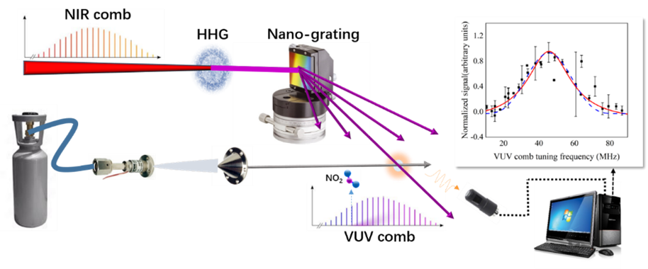 evo真人视讯研究团队顺利获得刻苦攻关,攻克了上述技术难点,成功在VUV波段实现了光梳光谱测量,成为当前国际上第三个掌握VUV波段光梳光谱技术的团队。结合对二氧化氮分子的光谱测量,证实VUV波段光梳光谱分辨能力优于30 MHz。考虑各种光谱展宽效应后,得到VUV光梳梳齿线宽小于28 MHz。此外,顺利获得大范围扫描光梳重复频率,该VUV光梳系统还可以用于绝对频率精密测量,待进一步技术改进后,精度有望进入kHz量级。
