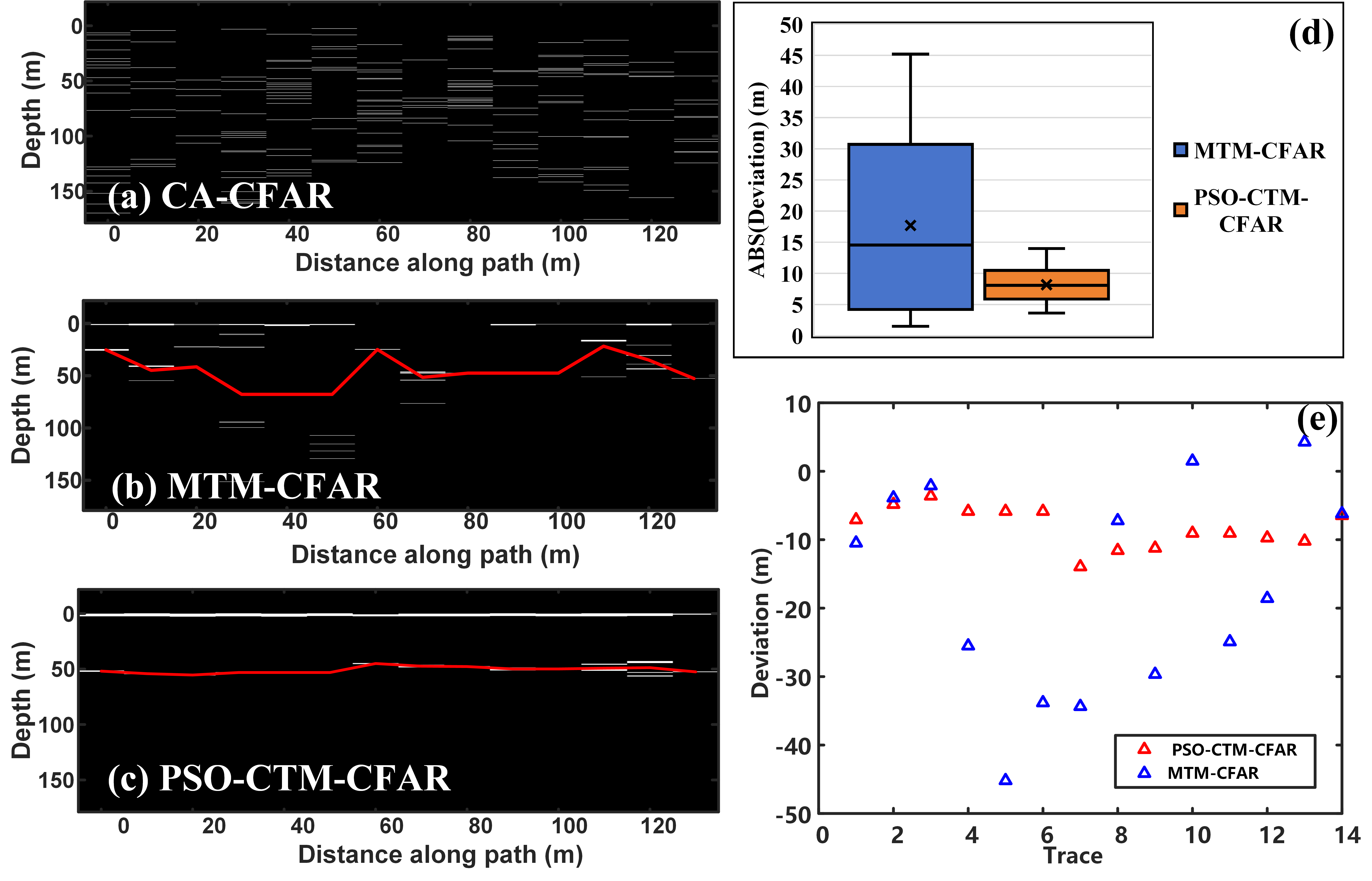 (a)-(c)八一冰川04测线冰岩界面起伏特征;(d)-(e)3种基于CFAR的方法的测量误差对比