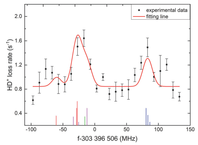 基于上述创新方法,研究团队首次成功测量了HD+离子(v,N):(0,0)→(6,1)的振转跃迁光谱(图2),跃迁频率值为303,396,506.7(20) MHz,相对精度达6.6 ppb,与当前最精确的QED理论预测值一致。结合理论计算,团队进一步推导出质子-电子质量比(μpe)的值为1836.152648(45),与国际科学技术数据委员会(CODATA)2022年推荐值一致。