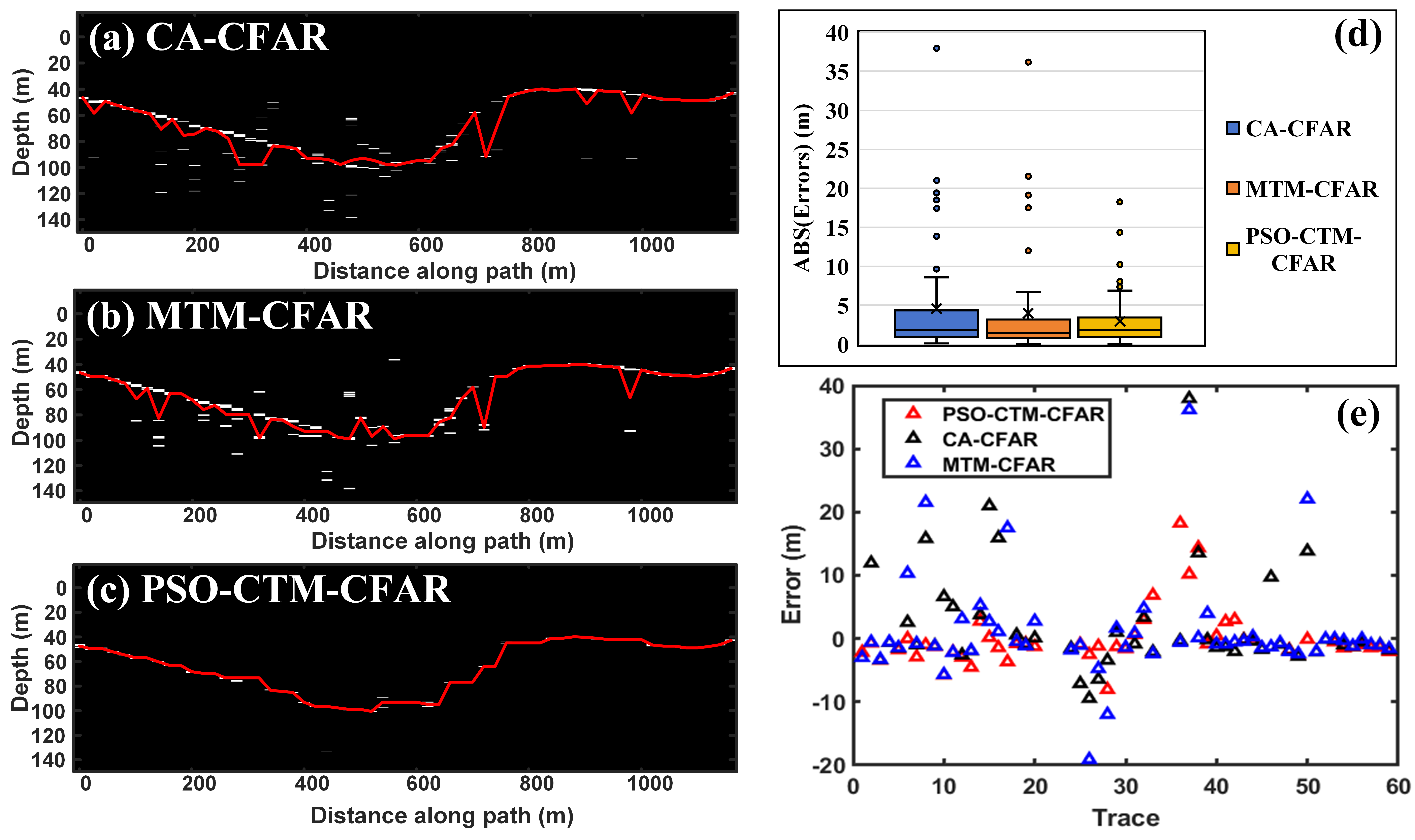 (a)-(c)八一冰川04测线冰岩界面起伏特征;(d)-(e)3种基于CFAR的方法的测量误差对比